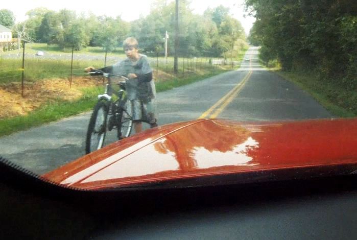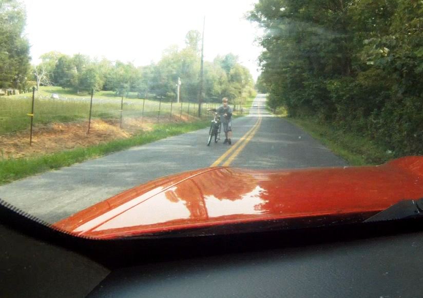 This morning I was taking the Camaro out for a drive and saw two kids riding their bikes on the wrong side of the road and swerving back and forth. As I got close one of them cut directly and unexpectedly in front of me. I tapped my horn and he looked back at me. Then coming back I met the same kid as I topped the hill pushing his bike up the hill right in the middle of my lane coming towards me. Luckily I was not driving like most do on this road or that kid would be dead right now. As I went past I slowed down and told him he needed to get on the other side of the road and on the outside edge before he gets hit. As I drove off he gave me the finger and continued pushing his bike up the hill in the middle of the wrong lane. Just about then I looked in the mirror and I saw a van top the hill and have to abruptly swerve to miss him.