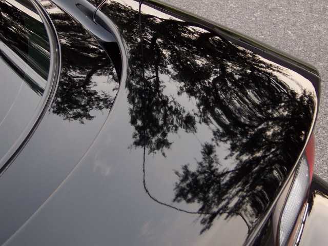 Basically, I've had more and more scratches show up over the last year that I could not tell you how I've gotten. It looked like someone set down a box on the back rear of the spoiler and BAM...there were about 9 vertical scratches and one horizontal. All over, more scratches in the clear coat that when washed and dried, stand out like a sore thumb. It's been getting on my nerves. I've used the Mothers Stage 1 polish, Stage 2 shine, and a coat of wax. But, it just doesn't get rid of all the scratches or all swirls. So, I called my bud who restores old trucks. We used various sandpapers on the clear coat cutting down a bunch of scratches making the beautiful black paint very cloudy looking. We hit it with some rough compound, then the stage 1, 2 and wax. I stayed up from 12:30am to 4am yesterday morning doing the hood and trunk. I used Meguiars Scratch X for a basic swirl removal on the hood by hand...applying and removing. I used Mothers Stage 1 w/ the orbital buffer, and then Stage 2 also w/ the orbital. I then applied the Meguiars Gold Class caranuba wax by hand and removed it by hand, polishing it w/ a terry cloth on the orbital once the wax was removed. I did this very, very lightly. Now...for the pix. Before and after on the spoiler. There were some pretty good scratches here. You can see the swirl marks in the clear coat in the first two. |