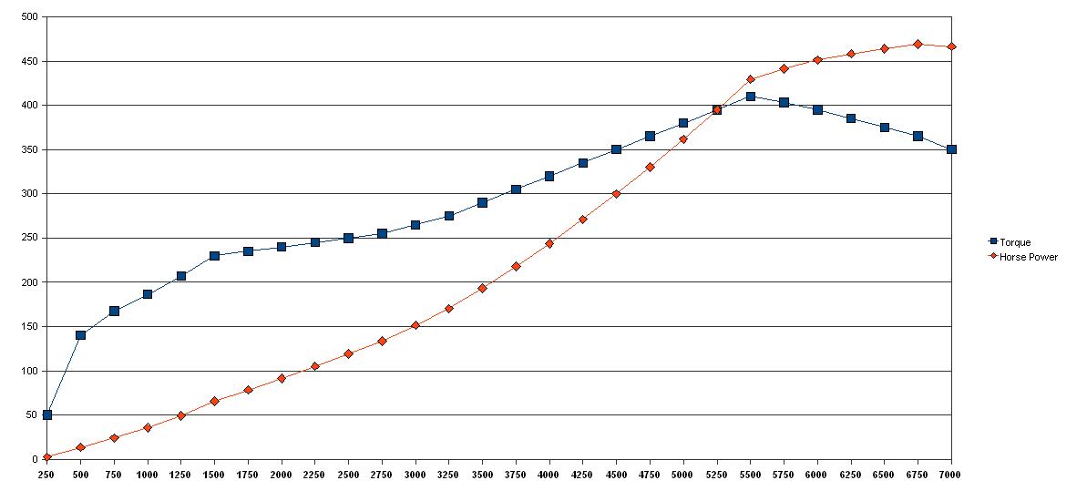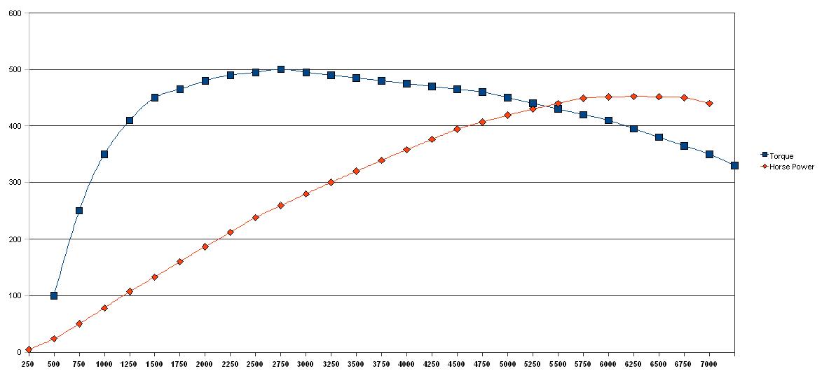 hp = torque*rpm/5252 horse power is what ultimately determines your acceleration but torque is important in determining when you will get that acceleration. I've created 2 dyno sheets with numbers that I essentially made up. They both make over 450 hp. One is for a torquey engine the other for a 'peaky' engine that makes a few more hp around 6000+ rpm. These engines roughly approximate what a small european V8 would be like compared to say a old 454 big block (though neither chart is based on much more that what I think is a good torque number at a particular RPM) Its established that both make nearly the same peak power. However, lets take a look at how they behave at lower RPM's. The torquey one is is producing 200 hp at about 2100 rpm, but the other needs to be up to 3600 to make the same power because its only making 100 hp or so at 2100 rpm. This is the advantage of low end torque: more 'area under the curve'