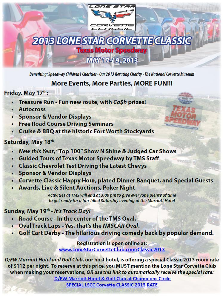 ![]() Visit Our Facebook Page: http://www.facebook.com/#!/LoneStarCorvetteClassic We are always updating the page with new information and special guests. Visit Our Homepage to register: http://www.lonestarcorvetteclub.com Do you like music? We have Golden Oldies ( and maybe some line dancing?) at the Classic Car Show! Do you like seeing how your 'Vette handles? The Road Course at TMS is for you! Do you like just hangin' with your friends? Win our Club Challenge and all your buddies get a reserved parking place together on Saturday! We've got it all, including a police-escorted Cruise to the Historic Fort Worth Stockyards ( 'memba that from last year?) Come on down ( or up ) to Fort Worth in May and have a boot-scootin' good time! Feel free to post your questions here or on our Facebook page. People from all over the country participate, so invite your friends too! You never know who/what might be there.