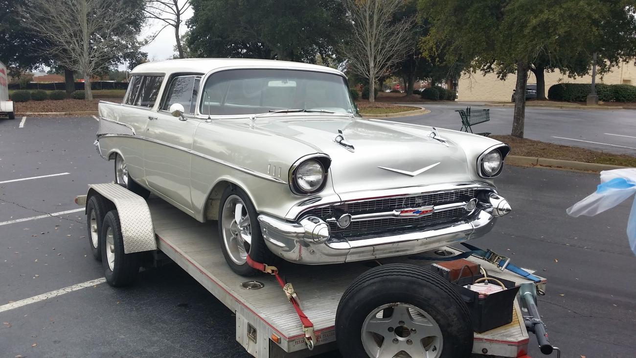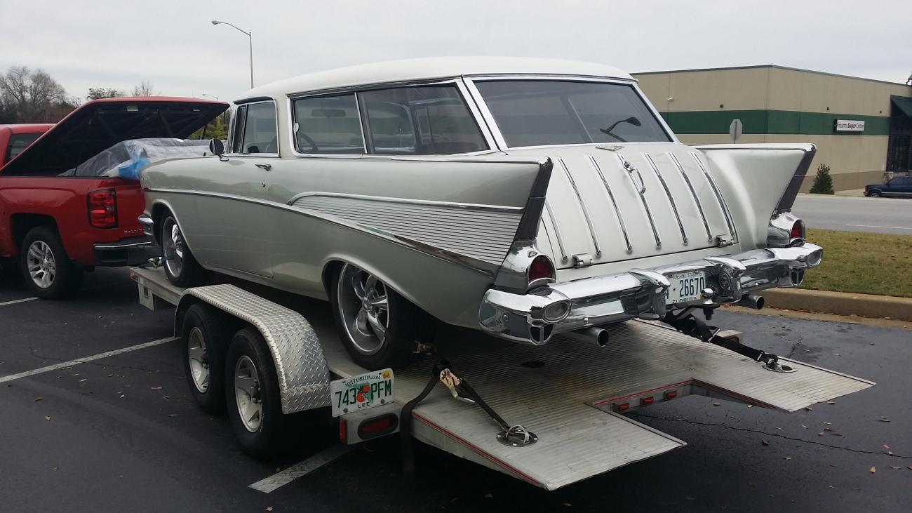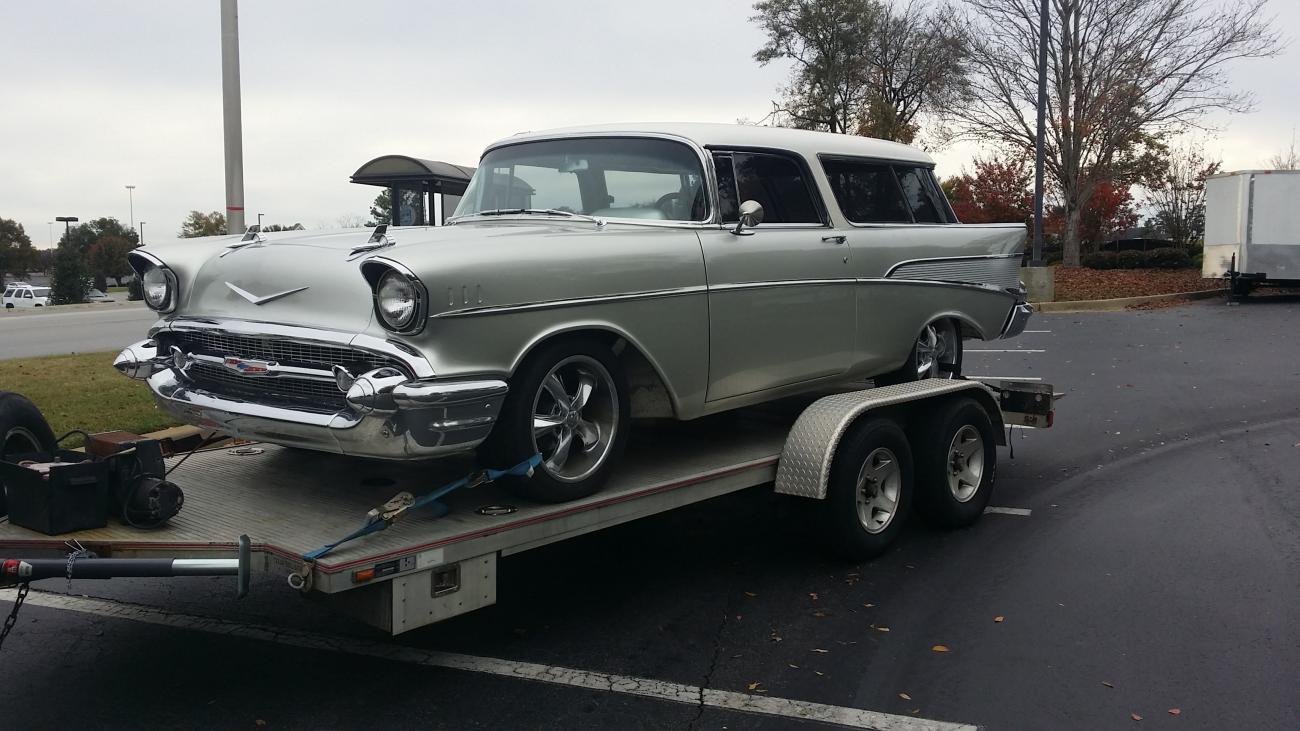 I went to lunch yesterday and ran across this beautiful 57 Nomad in the restaurant parking lot. Spoke briefly with the owner, who told me he restores and sells old Chevys, but this is his personal vehicle that he has restored and repowered with an LS1 and 4L60 powertrain. He'd also put disc brakes on all four corners. I guess he was towing it back home after a transmission problem, but the restoration and paintwork was impeccable. I have to imagine it is a lot of fun when it it is running.
