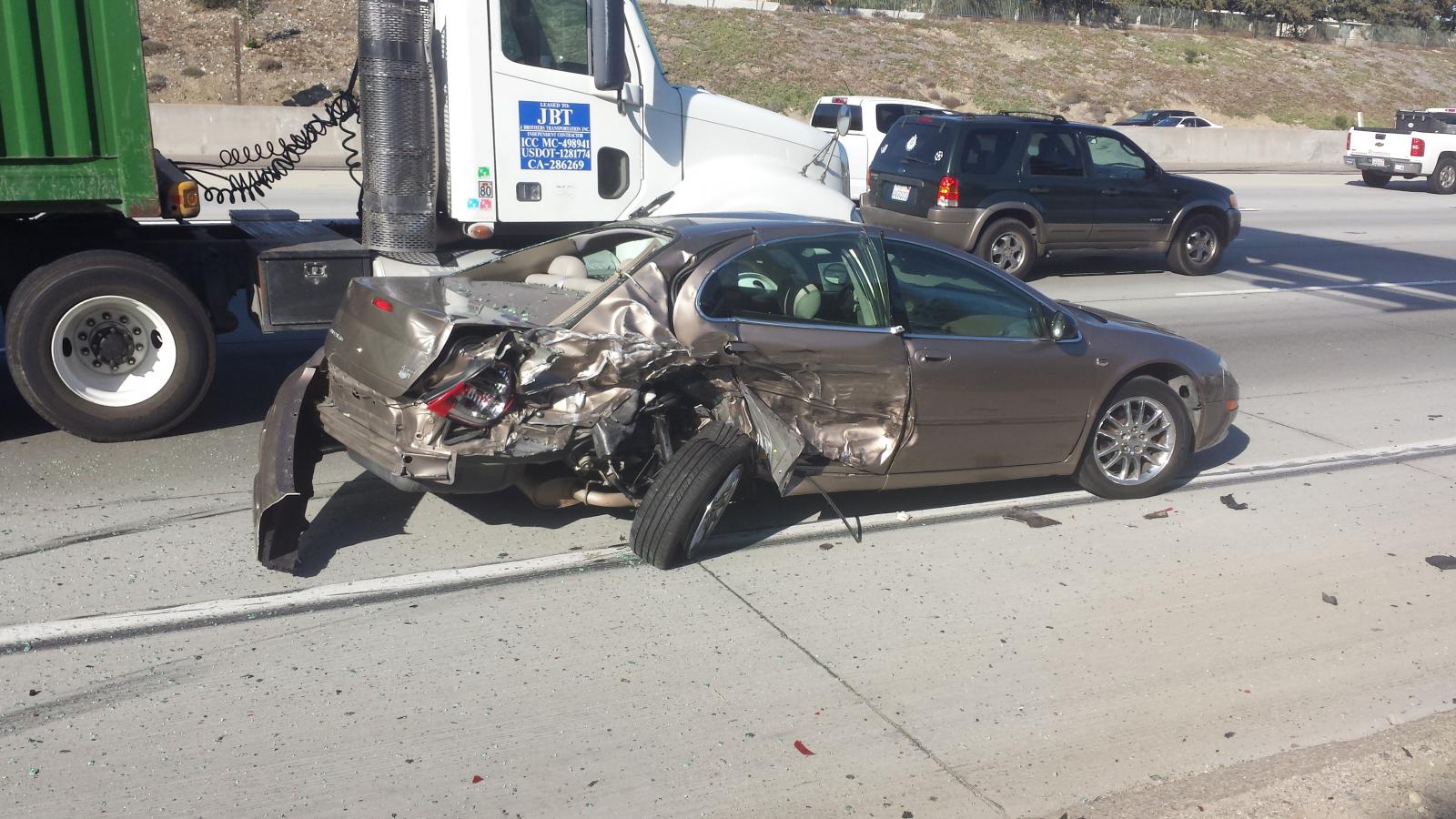 Only a few days before, I saw a much worse accident (Geez, is it bad luck to be within 100 miles of me?!?)... a flatbed truck hauling what looked like concrete block had rearended an 18- wheeler (on notorious Baker Grade, between L.A. and Vegas). The entire cab of the flatbed was gone... simply not visible. It appeared to have sort have collapsed upon impact, and the momentum then pushed the cab all the way inside of the leading trailer... it just swallowed the entire cab. Only the cargo portion of the flatbed remained, sticking out of the back of the 18- wheeler's trailer. No way the flatbed driver survived that... Highway Patrol appeared to be doing a fatality investigation at the time. |