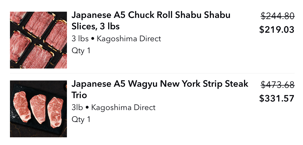 Just bought myself 6 pounds of A5 Wagyu from Crowd Cow. If you’ve never used them before, they’re awesome at getting authentic, Japanese sourced Wagyu beef. Not domestic or Australian………real. Free shipping, no tax and link through RetailMeNot.com and get a 10% rebate. Nets to about $78lb.