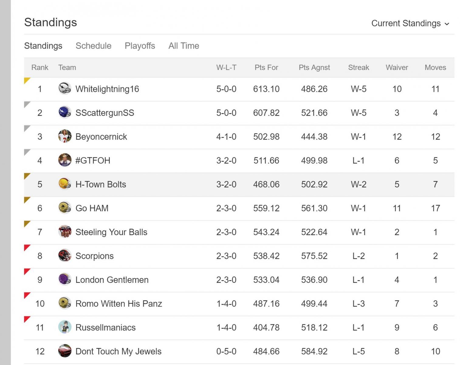 Keeper standings going into Week 6