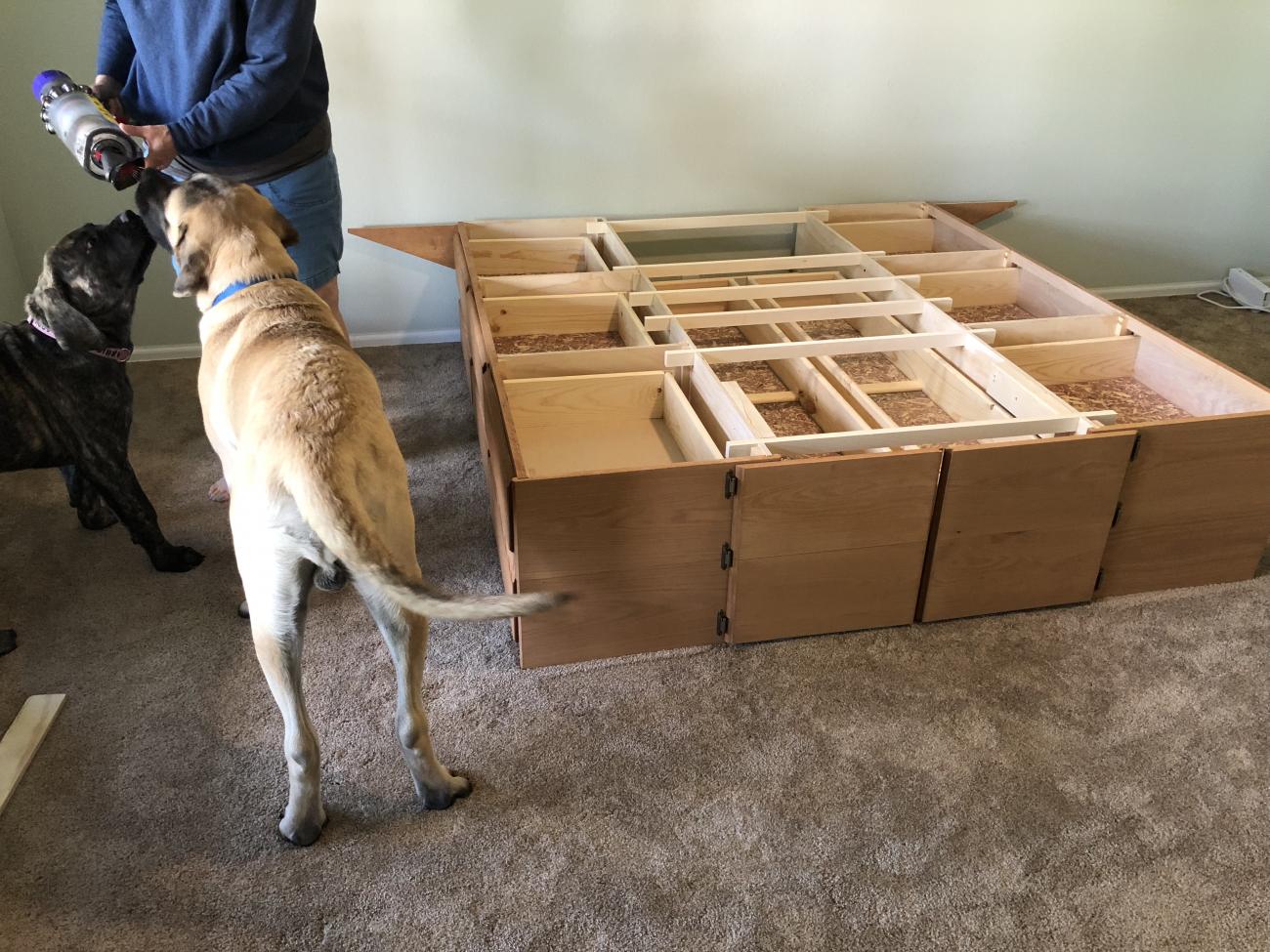 Here is the project I’m working on, and yes the Mastiff puppies are lots of “help.” We are to the point of building the platform... I’ll be up for a while.. my bride is going to get dinner... I’m to continue work... I snuck on here while she is feeding the pups... Shadrach is a male, the bigger one, at about 150 lbs at 8.5 months, and Abbie is a very thick solid female running over 90 lbs at 4.5 months.. she won’t be as tall but she’ll be thicker and heavier than him... he is predicted to go 225 lbs and she may go 250ish. Based on their parents...
