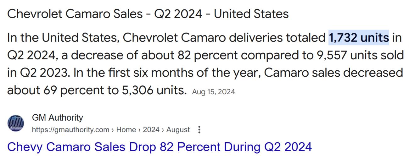 Meanwhile at Ford, Mustang sales are up since GM killed the Camaro and Stellantis put a speaker in place of the Hemi. And the new Charger is ugly anyway. Mustang - INCLUDING and IN PARTICULAR the ICE V8 and true three pedal manual transmission - are not only continuing production but recently Bill Ford jr stated the entire company is committed to the V8 GT with a stick alive and well long term after all the others are dead and gone. They are investing money to future generations of the Mustang GT V8 stick. Camaro failure is directly and solely the responsibility and blame of Queen Mary and her push to go all electric.