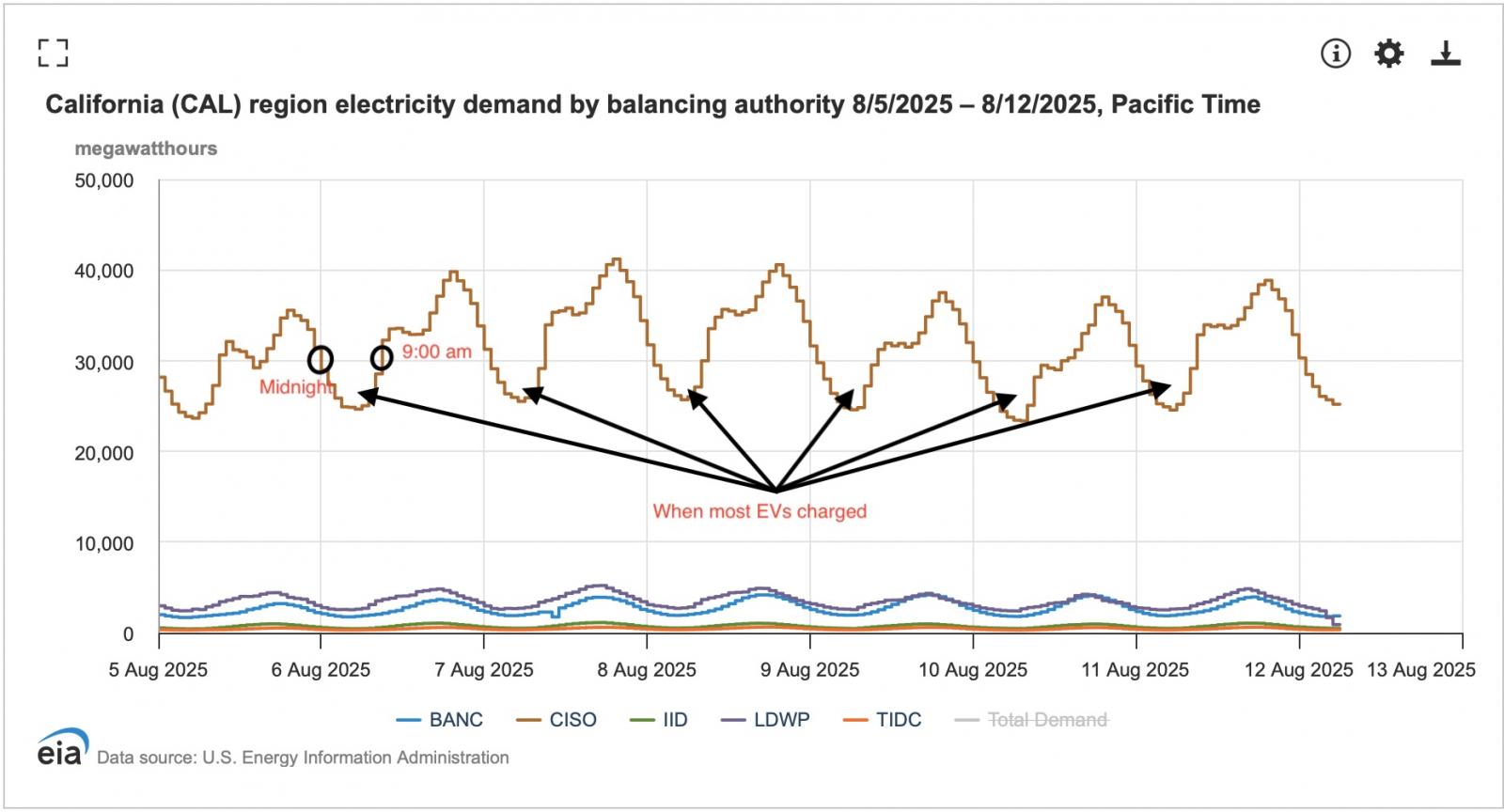 EVs also tend to have a balancing effect on the grid. Most charge during low use off-peak times, leveling out the peaks and valleys of the charging schedule. When California asked people NOT to charge their EVs at certain times, the impetus was on PEAK charging times, when businesses are operating full tilt and air conditioning use is at a max. Most people charge their EVs at home during the night when energy draw is at its lowest. Part of the directive was aimed at Uber / Lyft drivers who do tend to charge often during peak times.