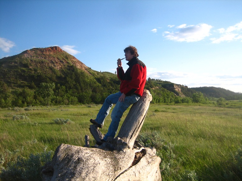 Picture one: on a break from work out in the north dakota badlands enjoying a corncob pipe.