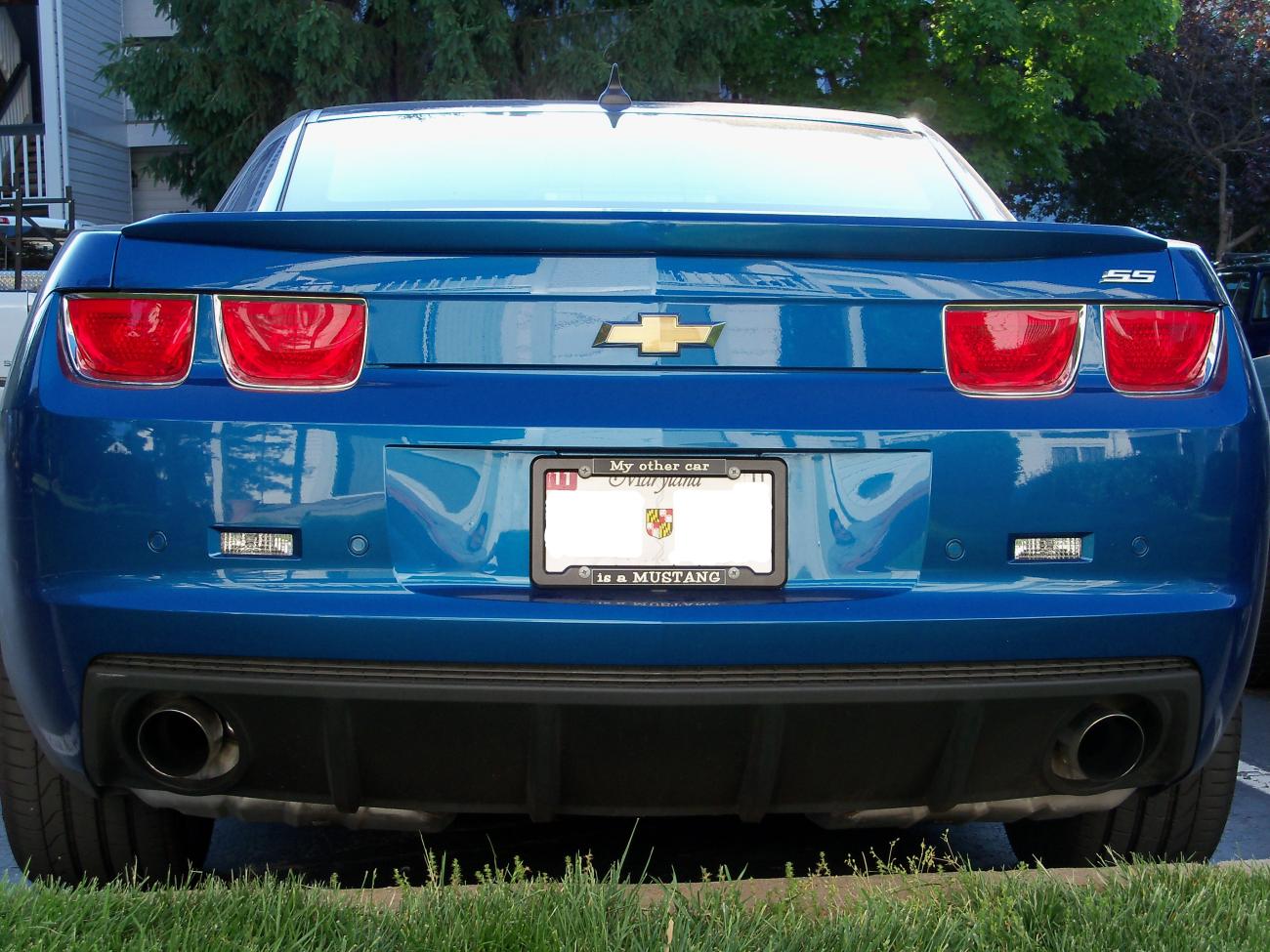 People have to find something better to do with their time than argue crap in this manner. That said, and me having nothing better to do... (Prices before tax) Ford GT Premium manual 33,695 White racing stripe +475=34170 Brembo's +1695=35,865 373 +395=36,260 (gotta compensate for that low-end somehow) Comfort package (for the heated seats, Camaro has them) +595=36,855 Electronics package (truly an awesome offering by Ford, totally trumps OnStar and worth the price IMO) +2340=39,195 Rear-view camera (also awesome, beats my backup beepers) +240=39,435 Coupe accessory package 1 - I love this kit, but it is essential to compete with the looks of my (IMO) better-looking Camaro +720=40,155 I have 20" wheels and I didn't add upgraded wheels into the Mustang. Total price I paid for my car: 34,768 2SS no RS, white stripes. I'm sorry to respond to a troll-like post and beat this dead horse, but nobody ever yells at me here and I wanted to bust my cherry. Maybe I can get in a flame war I can talk about when Im in an old folks home. And to show the level of my Chevy bias, having owned nothing but Fords my entire life, I will post a picture of my license plate frame that will ensure that neither Chevy nor Ford guys will like me: |