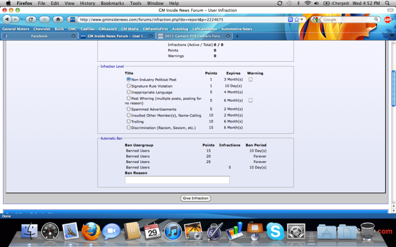 I've only used the post whore infraction two or three times. It's really just for troublemakers who post the same crap over and over again, I had a guy from the UK who hated his Cruze for whatever reason and literally posted the same complaints in every thread he could find that mentioned the Cruze. Needless to say, he's gone.