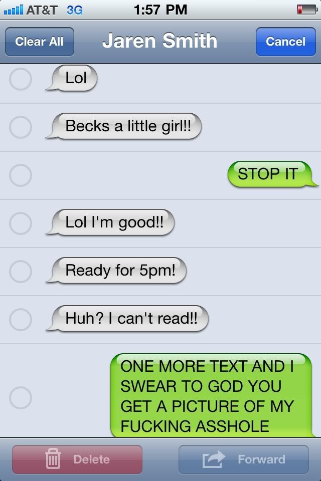 THE THREAT IS REAL AND APPLIES FO ANYBODY. ONE MORE TEXT AND IM DEAD ****ING SERIOUS.