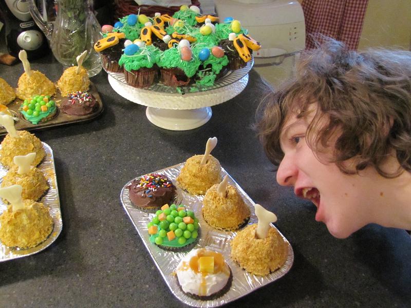 The subject of cupcakes reminded me of a cupcake baking spree I had. The monster eating them is our goofy kid.