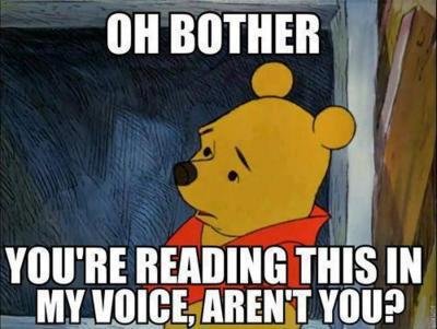 doesn't help that there's a guy on tv at present who is talking with a "winnie" voice anyhow. Yes, "Oh bother" came off as winnie in my head. I suppose it works the same with foghorn leghorn too.