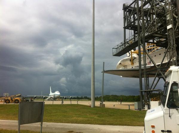 Endeavour passing by her home for nearly ten years one final time.. OPF-2. And her sister which is inside OPF-2, Space Shuttle Atlantis. The two will never see each other again.