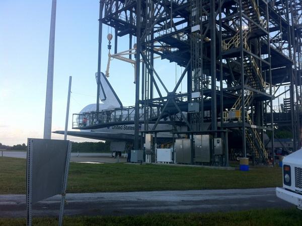 At 9:30 am, ground crews dropped the yellow sling that will be used to hoist Endeavour as high as 60 feet off the ground.