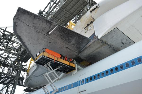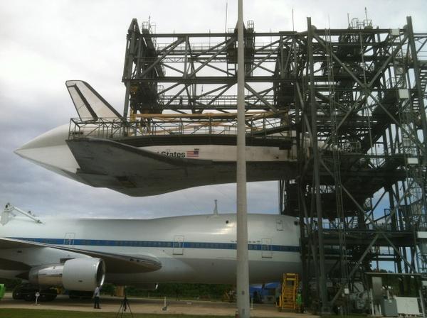 At 7:20 am, Endeavour reached the Mate-Demate Device. The MDD is the lifting structure that NASA uses to place/remove an orbiter from the top of a SCA.