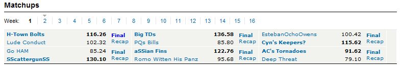 Aside from Brandon Marshall, I don't think I'm doing too bad this week. It sure is a close game with the seattle def with two turnovers and a TD in the first 5 minutes of the game...