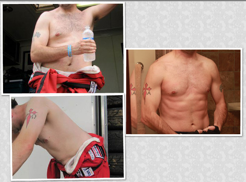 Hey folks, I'm actually kind of embarassed to post this pic, but I put it on my facebook as well. I try not to be vain, and I kinda laugh at flexing pics, but I wanted to show people this because I feel like showing the commitment I made to eating better may hopefully inspire someone else to. 1 year ago today I made a life decision that the food I was eating (and the large quantities of soda and alcohol I was drinking) was bringing me down a path that would likely end in my early demise. I was having stomach issues, I was working out hard but seeing no improvements at all, I just plain didn't feel right, and I needed to change. So last year, today, I stopped eating junk food, stopped drinking soda, stopped drinking beer (well a lot of beer), and completely changed my diet. I didn't follow any plan, I just made sure to eat low sodium, low fat, better for you stuff. I avoided processed foods, stuff with too much preservatives, and I started to eat a lot of nuts, fruit, veggies, etc. I started to cook on my own more, and just make healthier choices when dining out or just at an office party (ie 1 cookie instead of 10). I also started eating a bigger healthier breakfast, and finally I got into High Intensity Interval Training, only 3 days a week. In a year I managed to drop 3 minutes off my best NYC triathlon time, while having done less actual working out than the past 3 years. In the race car my concentration and consistency has increased tremendously, I was having some fatigue problems in the past. The photos on the left are the worst ones I could find of myself, they are from July of last year, the one on the right was taken this evening. Last year's photos I was 158lbs and having major stomach issues, now I am 140 and physically I have never felt better. If you want some hints or tips I would be more than happy to share, and I am prepared for the jokes at posting shirtless pics of myself flexing that are sure to come. But I am proud of what I've done, and I hope some of you who are thinking about a change can see this and make a similar decision (I have some friends that have and I'm very proud of them). Thanks all.