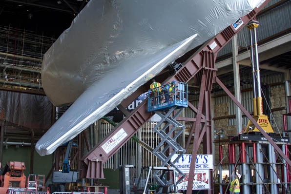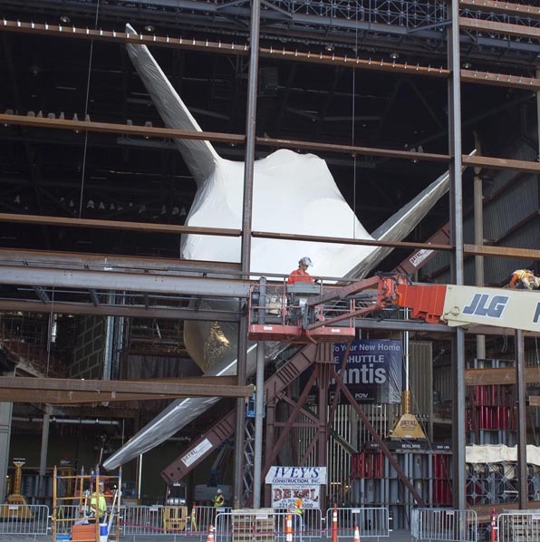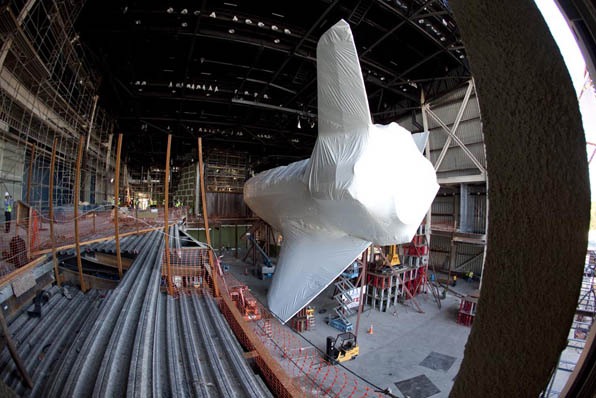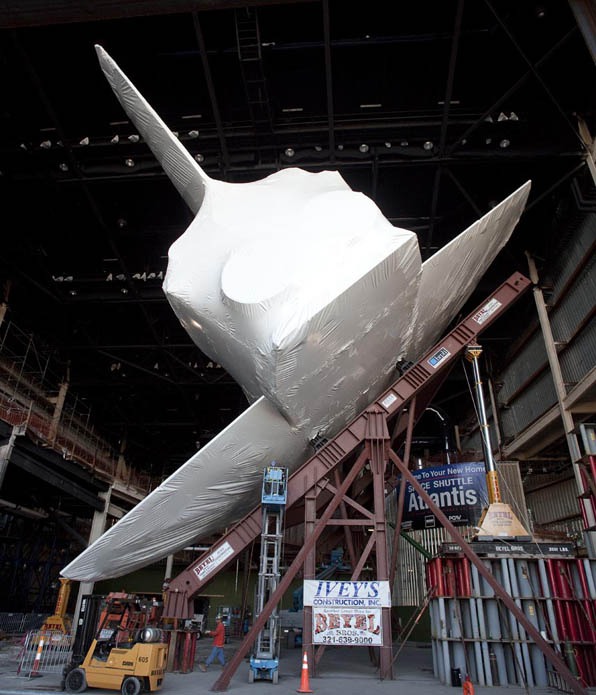 Fun fact: Atlantis' left wing leading edge sits just 7.5 feet off the ground. Something will be put under it to prevent people from touching her.