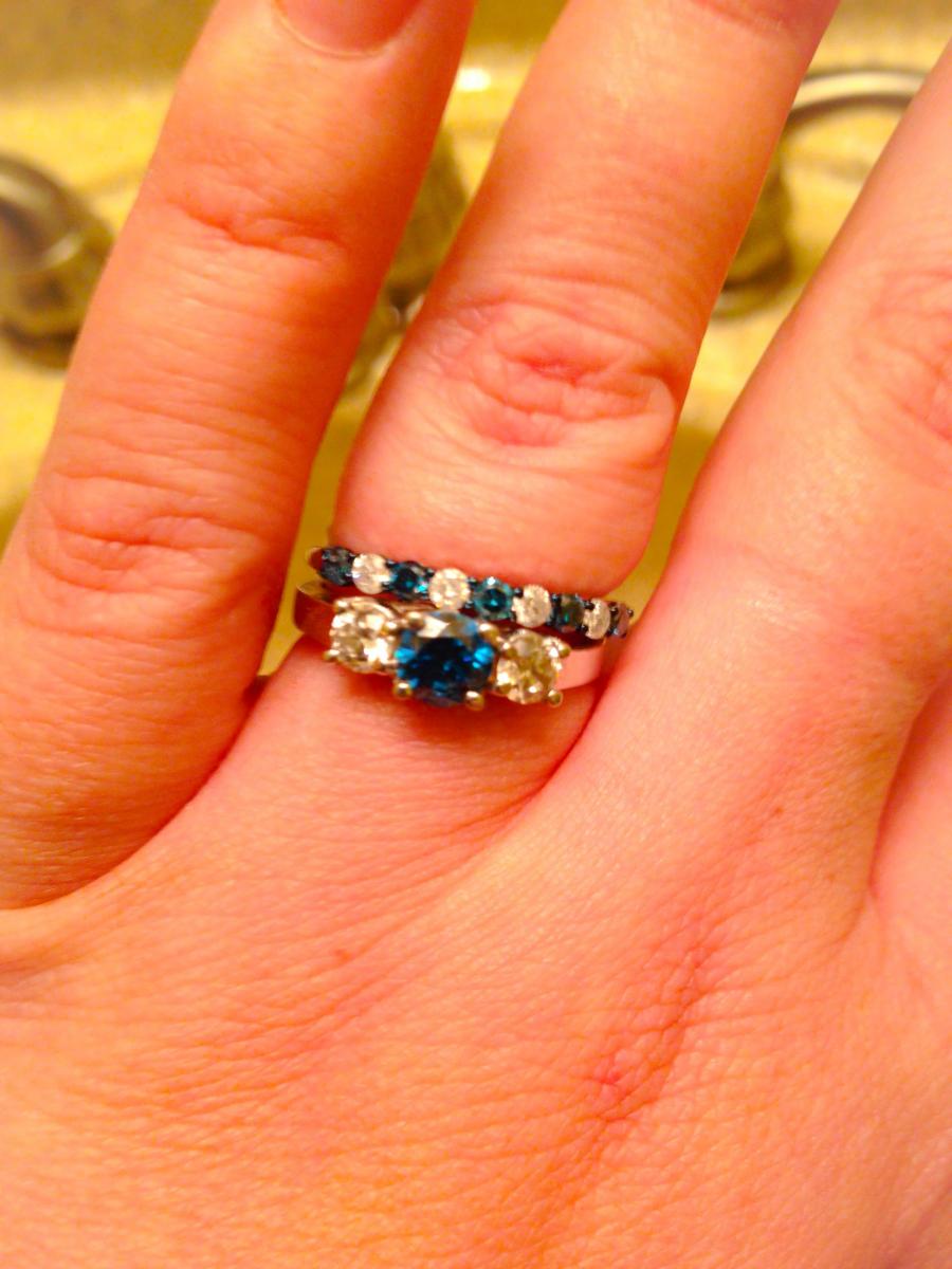 Since Jarrod gave me a hard time about the blurry pic of my engagement ring here's another shot, this time with the matching white and blue diamond wedding band.