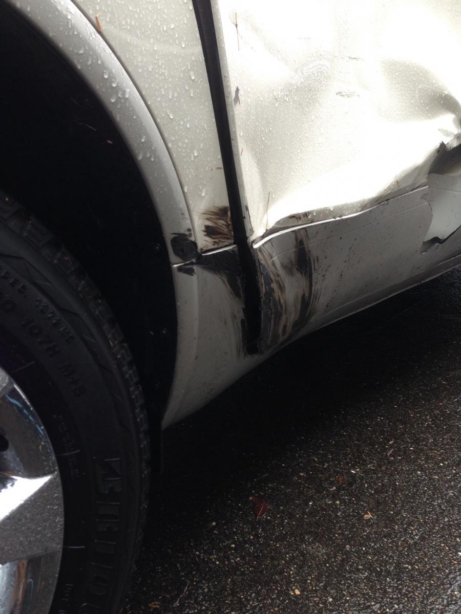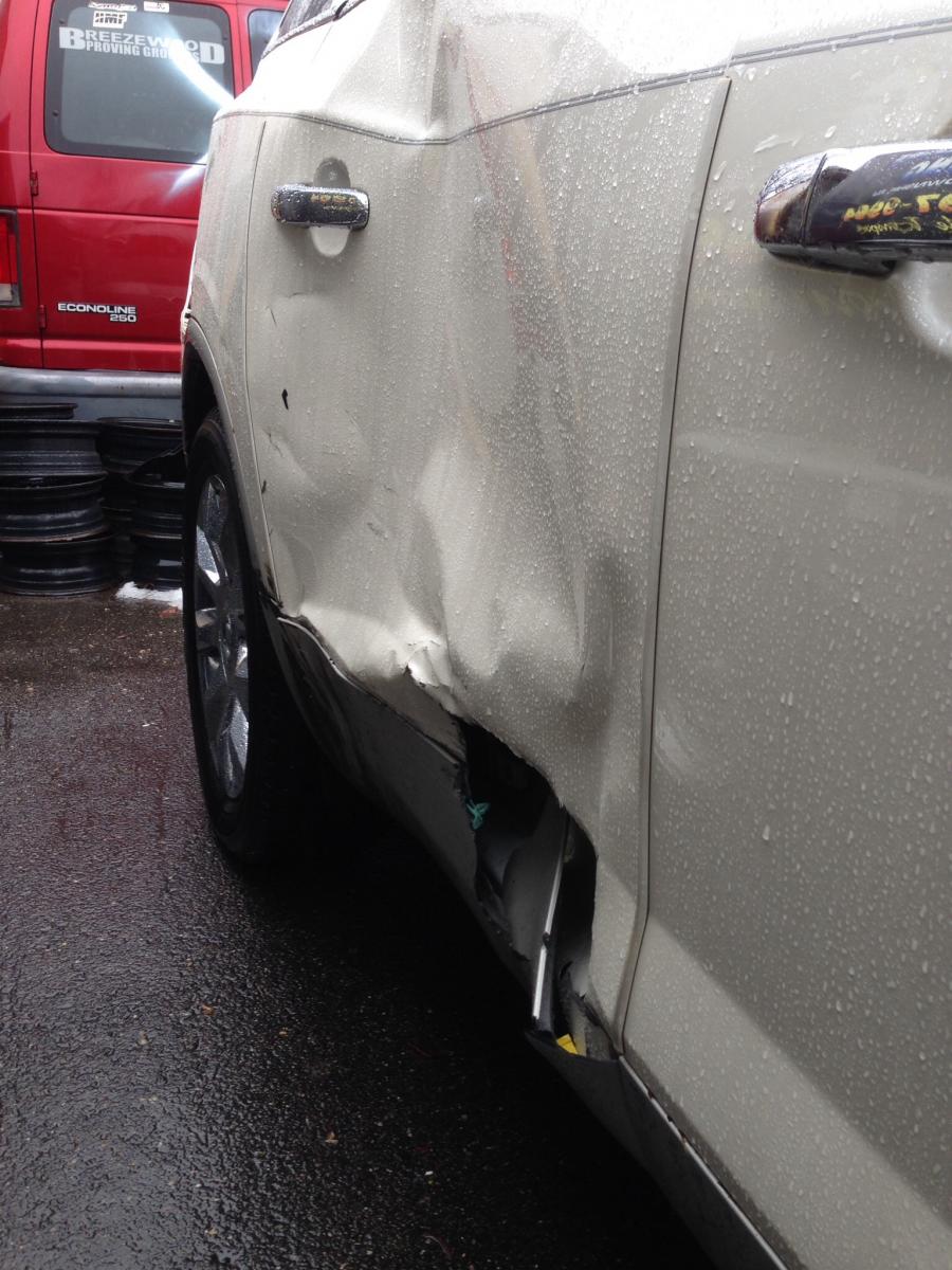 The other car tried passing my wife on the right side while in a snowstorm. Clipped her rear passenger door with his bumper and tire, throwing her car into a spin from the middle lane and she lost control of the car and left the highway and hit two trees. Mean while the other driver kept going. State police thought she just lost control. But a further look at the passenger side door plainly shows the tire mark from the other car. It was written as a hit and run. Btw thank you On Star for calling for help. Here's the pic