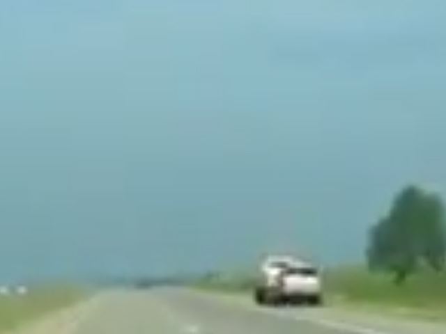 A car starts driving on the shoulder, unaware that a truck with an empty trailer is parked on the shoulder. It does a Dukes of Hazzard type jump, except for the landing on the front end and flipping part.
