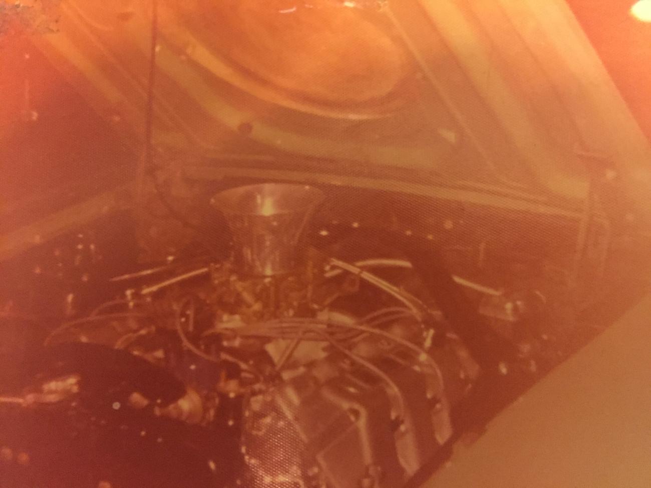 Engine with single quad and stock manifold. I took all the Ford blue off the heads and intake manifold. The large valve covers were magnesium. The heads used o-rings instead of head gaskets and were a pita.