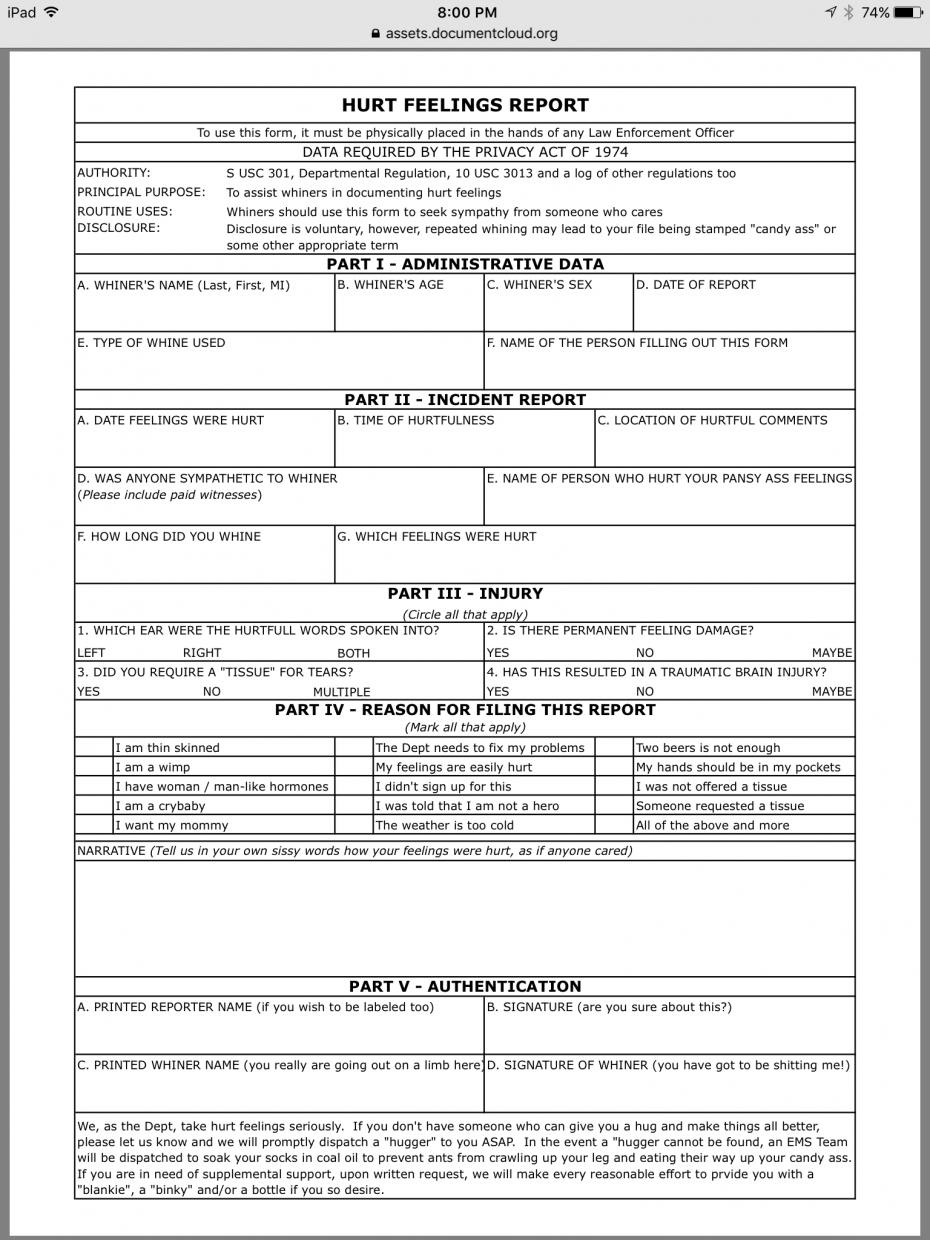 I am a supervisor for around 100 personnel and we had one of those hurt feelings reports floating around for a while as a joke. Well someone did get their feelings hurt by it and gave it to HR....we no longer have them. LOL