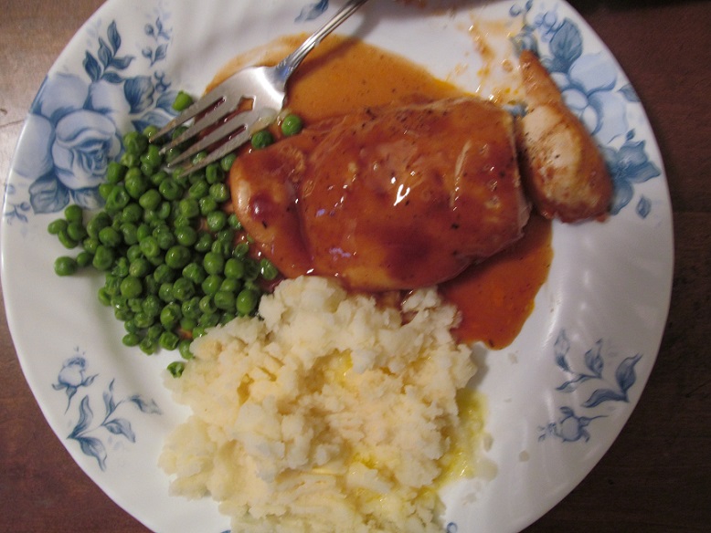 baked chicken in barbecue sauce and mashed potatoes and peas