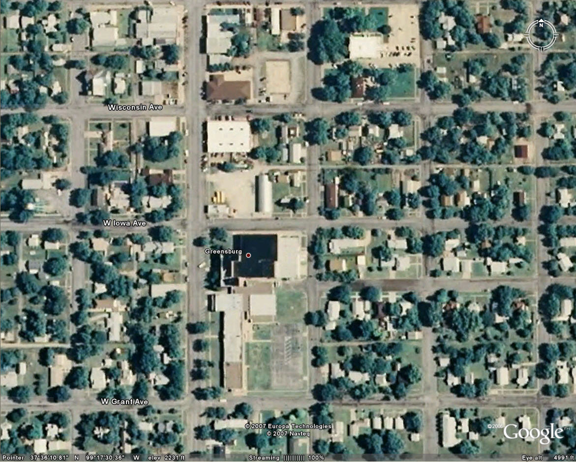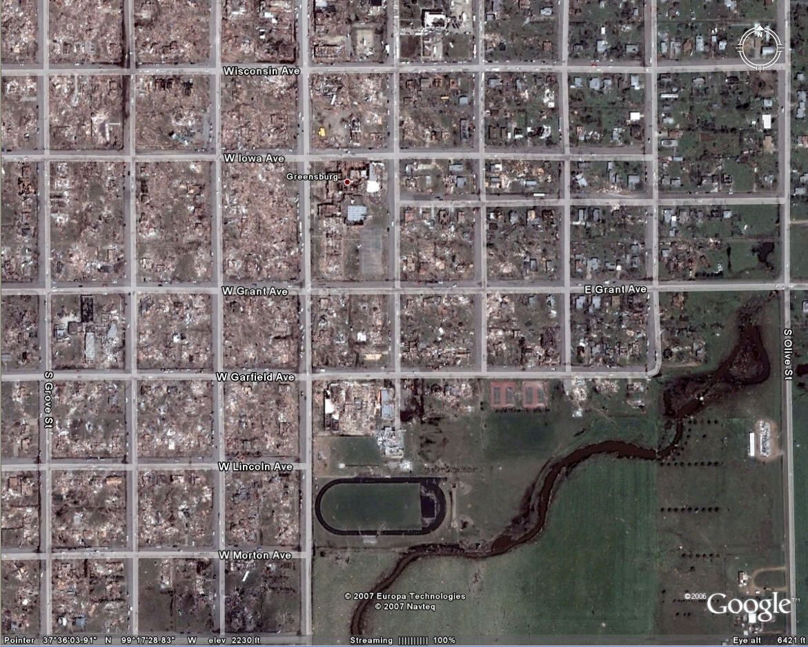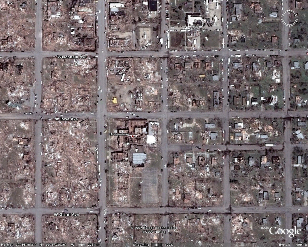 Before and After pics of a Greeenburg, Kansas hit by a tornado earlier this year.