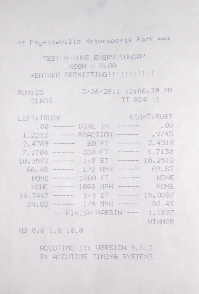 the second race was so close, that one above I spun a bit off the line so the next run I took it easier off the line..... spike beat me by 0.02 . It was so close, if it had been a 10ft longer race I would have had him. It was so close, I didn't know who won til we got back to the pits and I checked out my slip