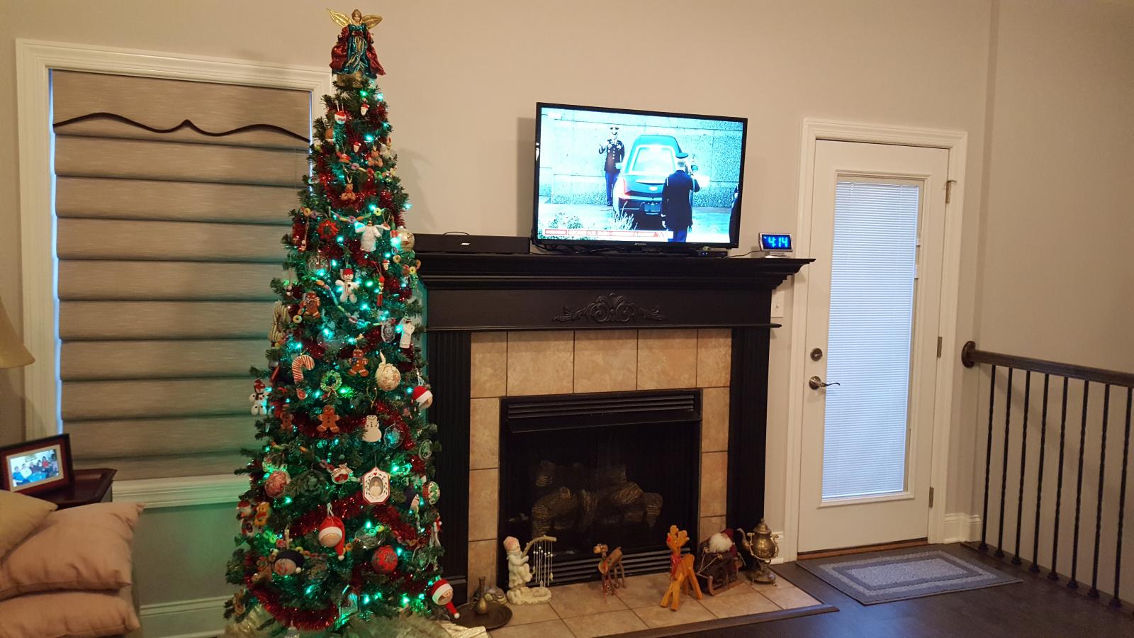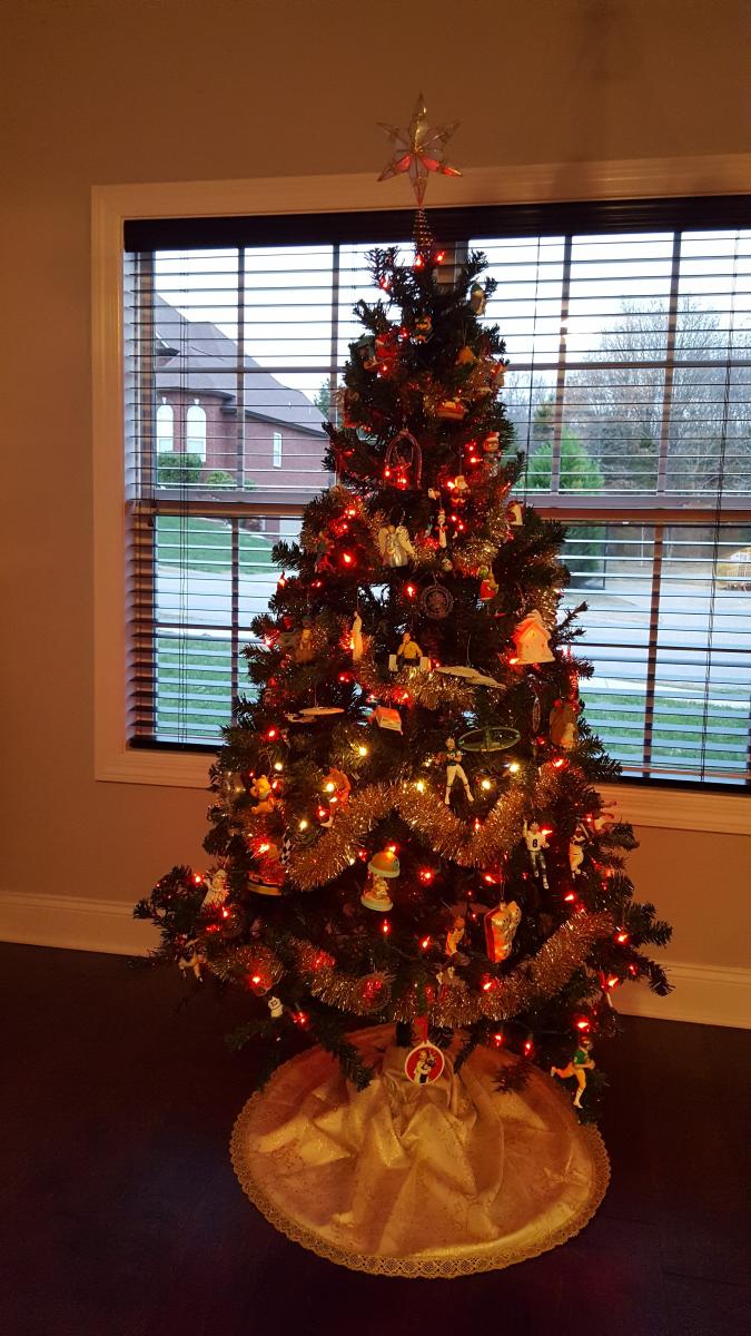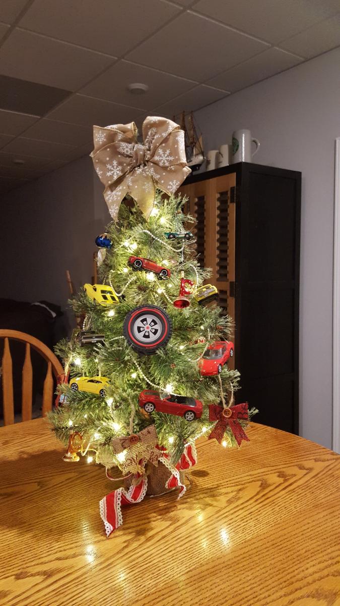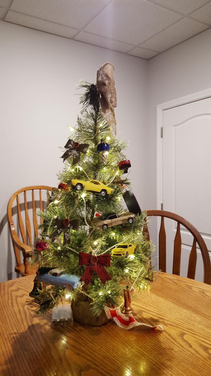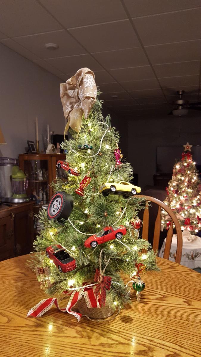 First Christmas trees in the new house. The Great room one is mostly hand made ornaments made by my mother. father, sisters, friends & me. Kitchen one is my Hallmark ornament one. Then in the Den my burlap ornament one & the little Camaro/sport/muscle car one.