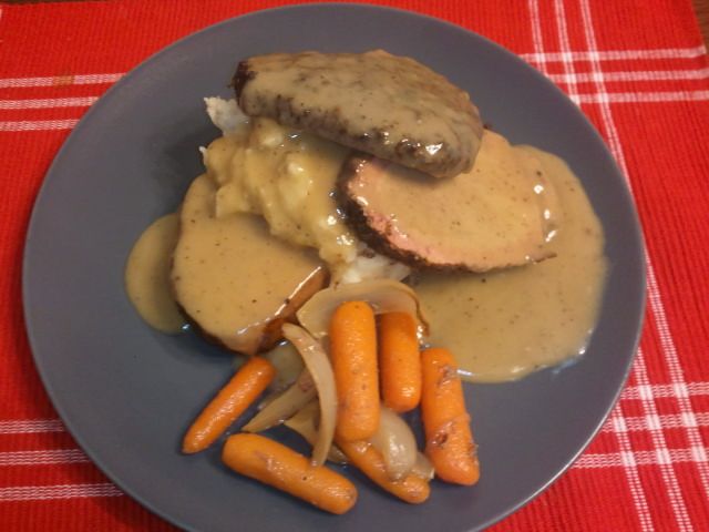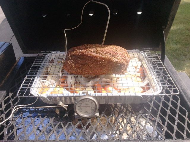Smoked beef roast, onions, carrots, potatoes, beef broth in the pan. Low and slow cooked.