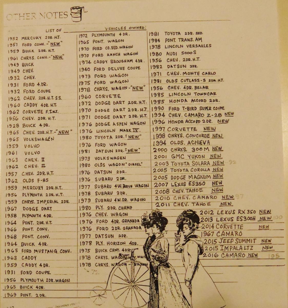 Below is a photo of the List of the 105 cars in order of ownership.