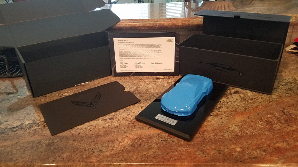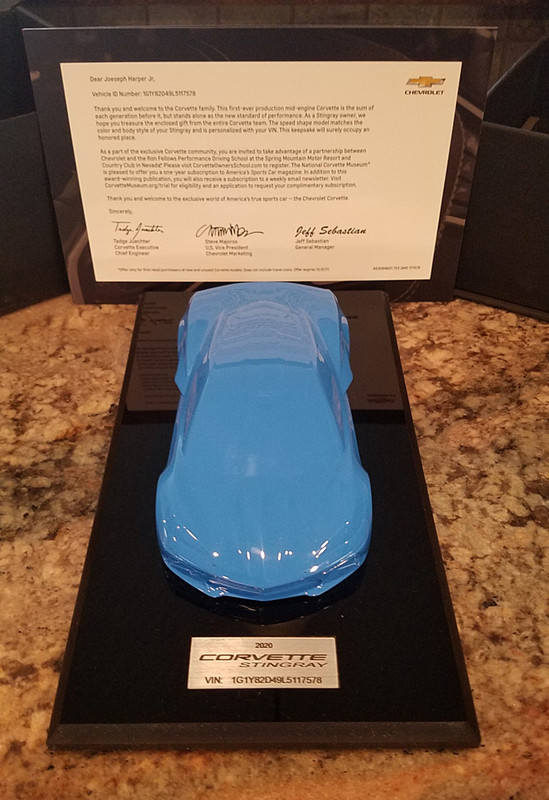 Had a FEDEX truck pull up this morning, total surprise....as I wasn't expecting anything that neither myself or wife had ordered. I knew this was coming, I just didn't know when, its been 10 weeks since my car was built. Anytine you special order a Corvette, you get a gift of some sort from GM. In the past its been a nice large poster sized print. For the 2020 model year, and this year only they gave us a mounted scuplture of the car in the color of your car with an I.D, plate with your VIN, with a letter of authenticity. Pretty darn cool!!