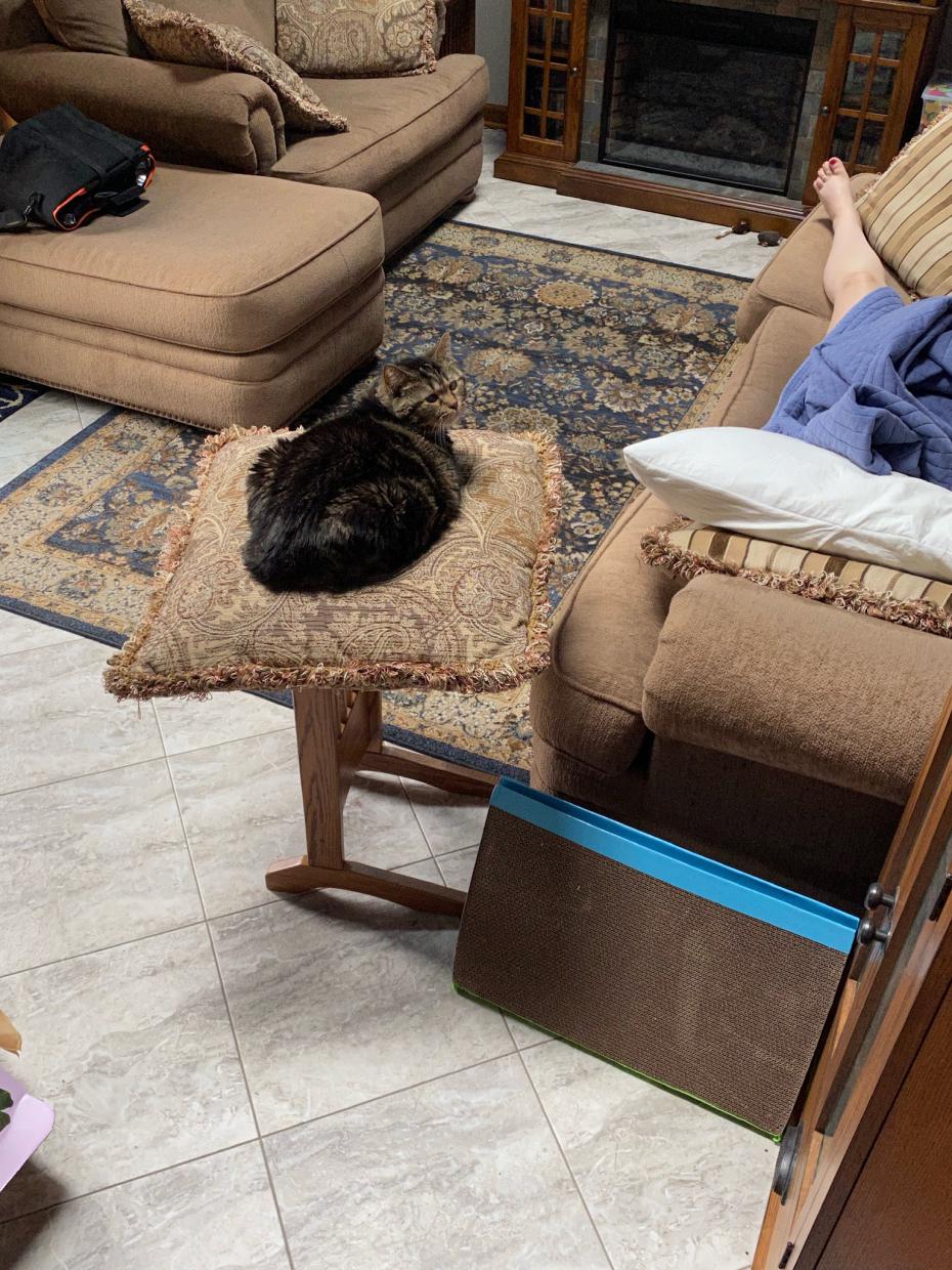 A broken cat that would rather rest under the cushion.