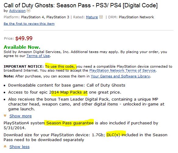 Game Code - so I guess no hard copy just download to the console? Map Packs - so they have other maps to purchase Season Pass - WTH is this. Do I have to keep paying each year to play online or something? What's a DLC? Stay tuned... newb here with many more questions to keep you all busy while you wait. |