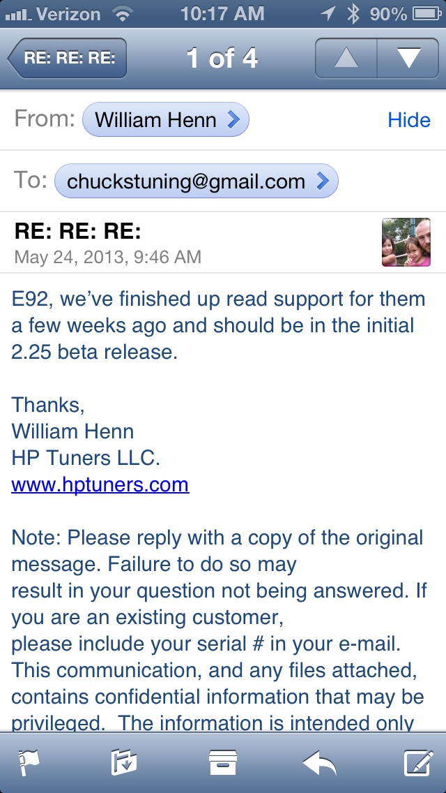 Having said that, I emailed Bill @ HP Tuners while reading this thread and he confirmed (in the attached screen shot) they fully anticipate E92 support in the 2.25 release. As with any new platform, I'm sure the adjustable parameters at first with be a bit basic... but that's never stopped any of us. Shit, back in the day we did a cam swap on a C6Z before anyone supported them at all (made 505 on the stock tune). So yeah, doom and gloom isn't going to stop any of us from figuring these things out. If you sit around thinking about things too much, you'll never get anything done... which is the general gest I get from this whole thread.