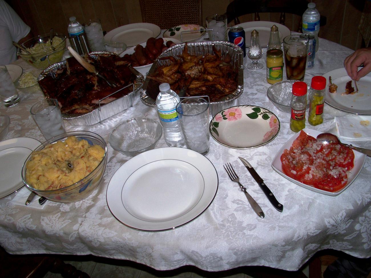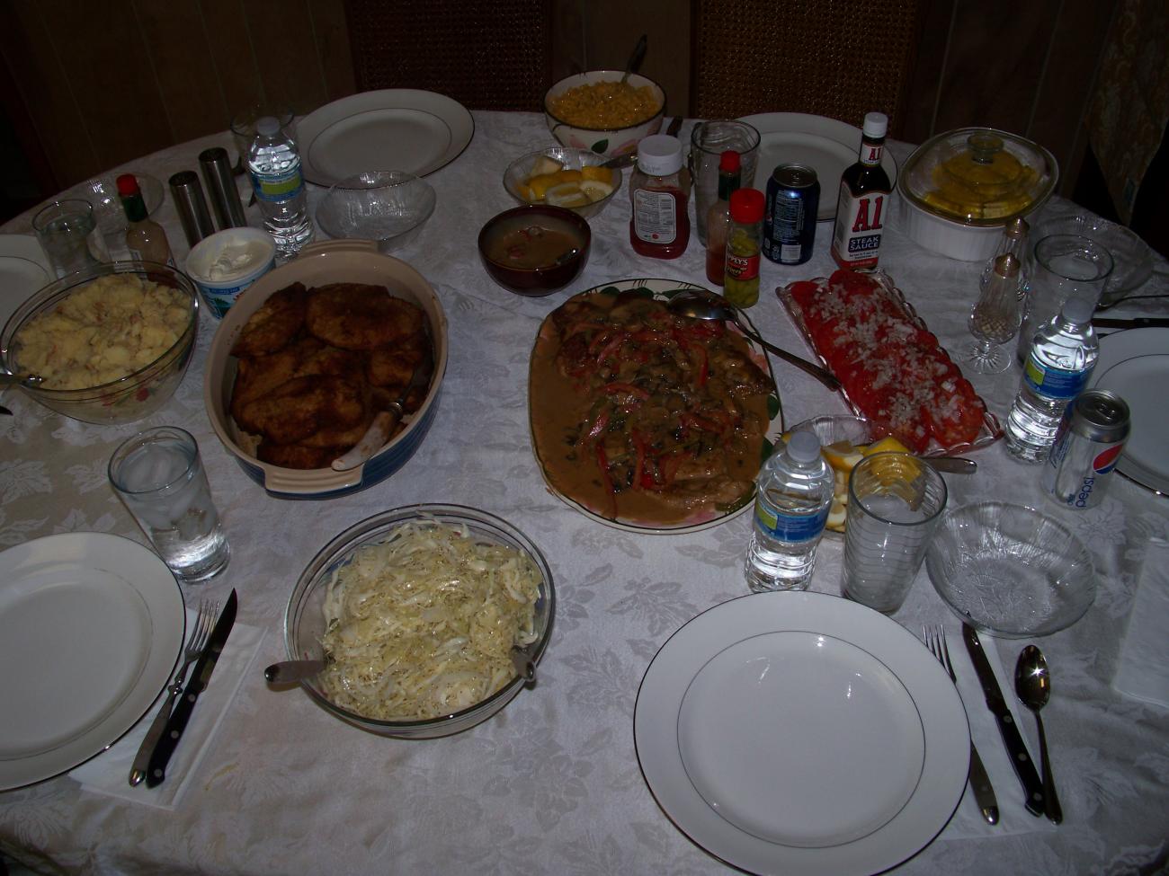 Here are a couple of examples of why it is hard for me to lose weight........My mother-in-law. One is shnitzel & yeager shnitzel, German potato salad & German slaw. The other is BBQ chicken wings, ribs, wurst, brats, etc. I just came from there today where they cooked massive almost 2 in thick t-bone steaks but did not think to take any pics.