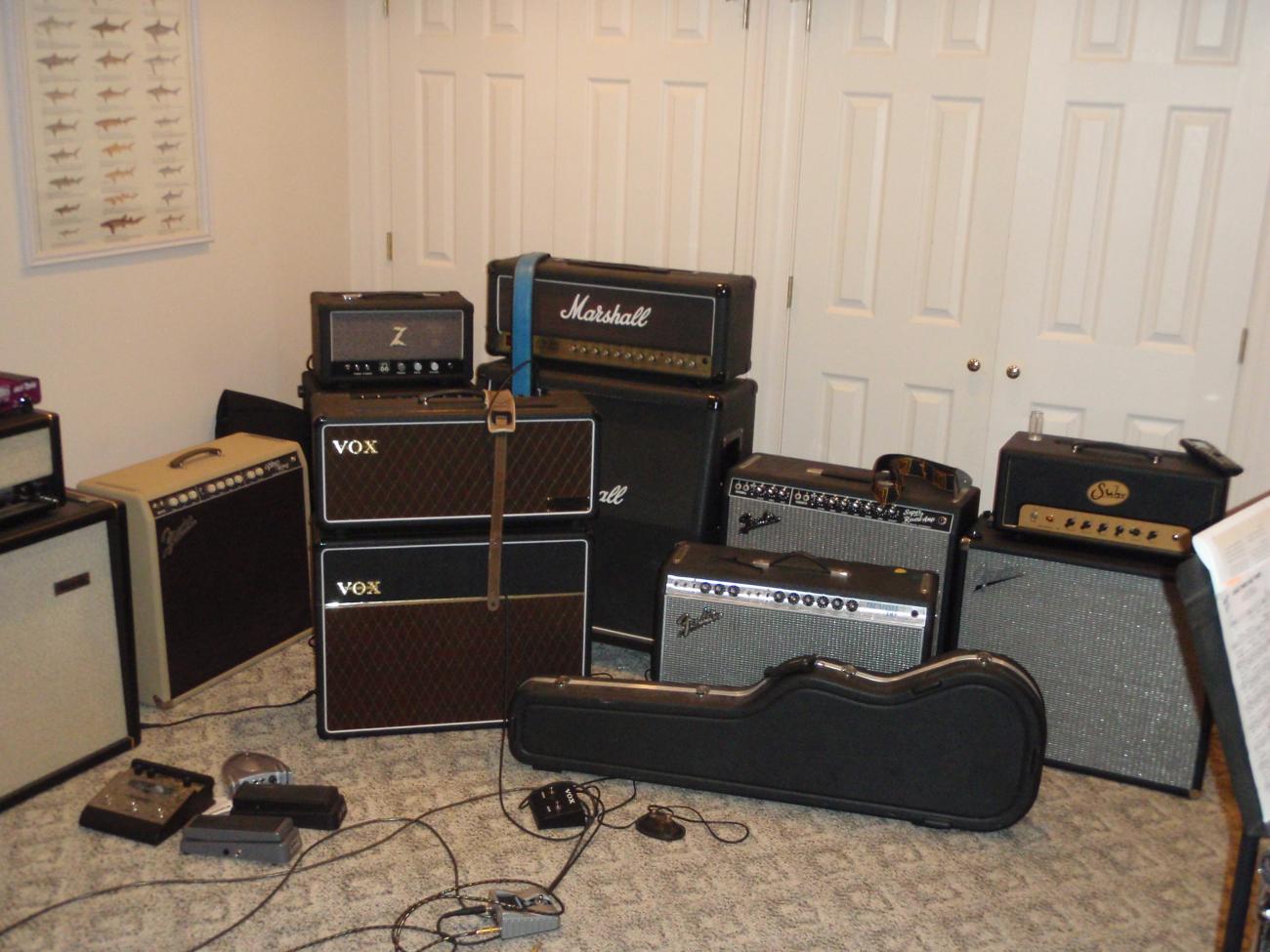 From left is my Kay upright 3/4 double bass (I play in the Tater Town String Band, bluegrass if you didn't know that), next is a solid body Telsco Del Ray electric guitar that was my dads. The next two are both American made Fender 50th Aniversary Jazz Basses the first a Deluxe 5 string with active electrics, the other a 4 string. The next is my Taylor accoustic 960 and the last guitar is a Yamaha 12 string. I have three amps, a Berringer Ultrabass BX4210a with twin aluminum speakers and a Fender 100 Amp Bassman. I use a Roland accoustic amp for the Taylor.