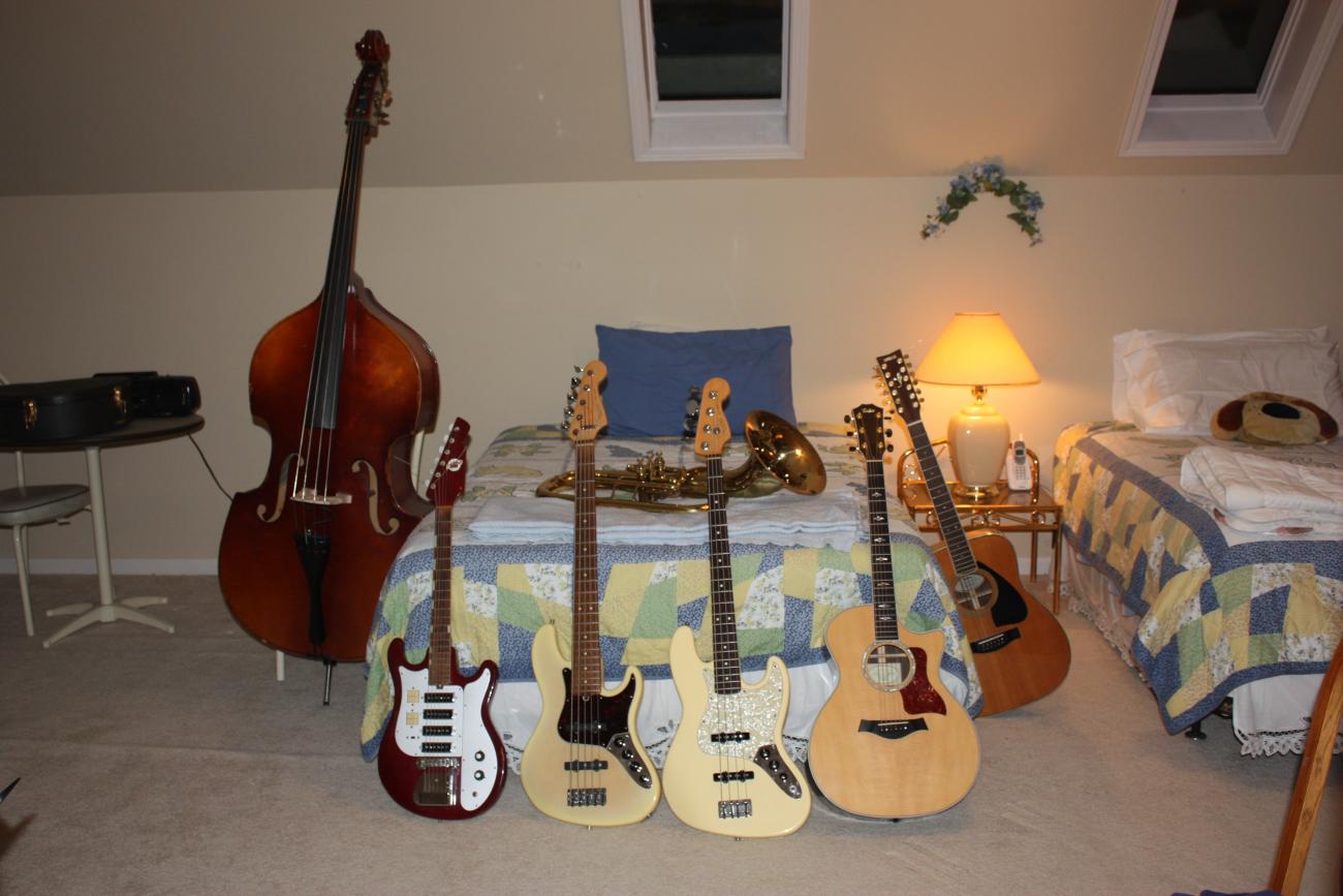 On the bed is my Bb Baritone horn that I've played since high school. I play bass and accoustic guitar at my church in both a praise band and orchestra. I play the Baritone on occasion as well. I guess you could say I like music.