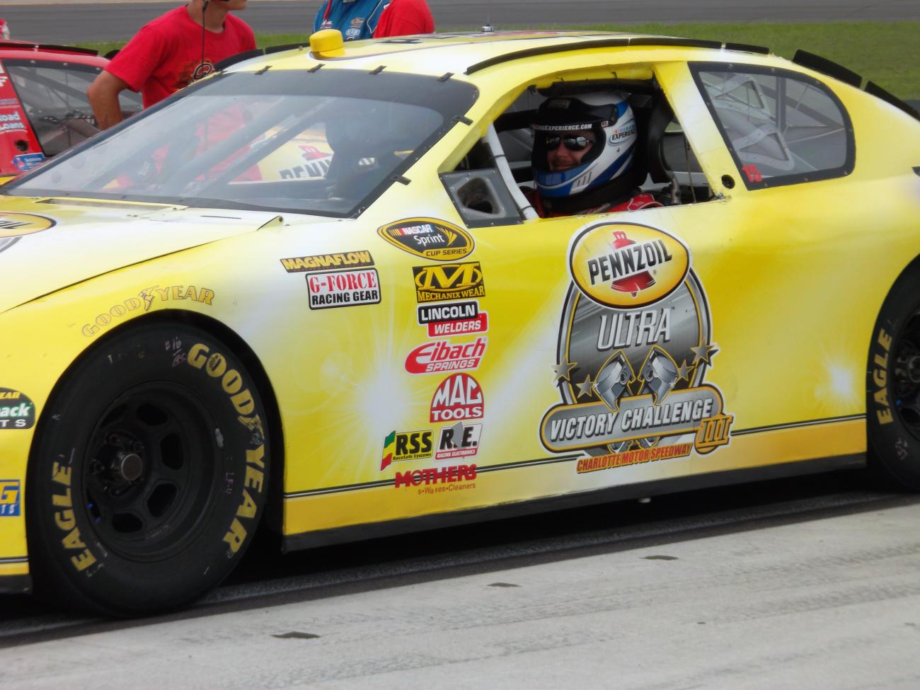 My husband on his NASCAR Racing Experience that I bought him for Father's Day. His fastest time was 168 mph. Top speed at the track is around 180.
