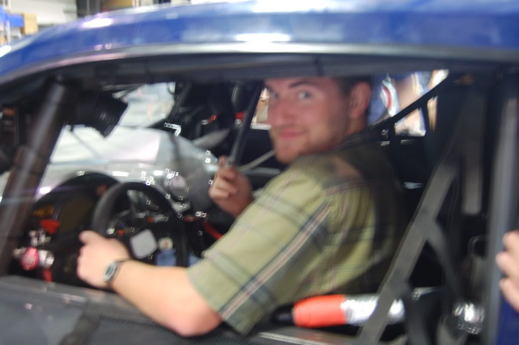 lol, something funny about this pic..... the drivers of the car are about 5'-6" and 150lbs or so..... the seat is molded to them, I couldn't even get one butt cheek in the seat, so I'm sitting up high and at an angle...... thus my knee is in the way so the steering wheel won't go on..... so I'm not only holding onto the wheel with my left hand.... I'm holding the wheel on!