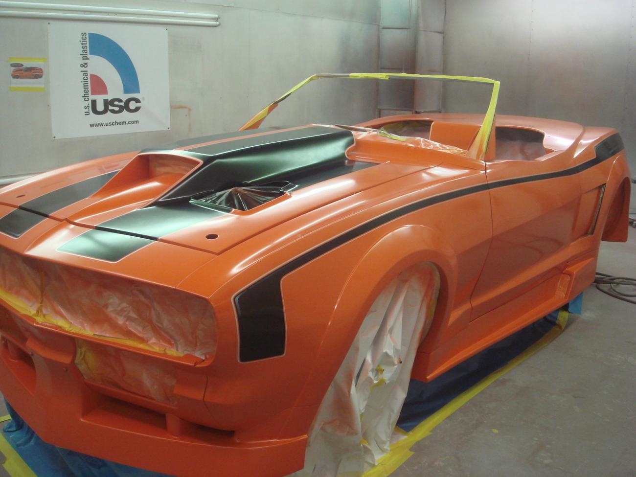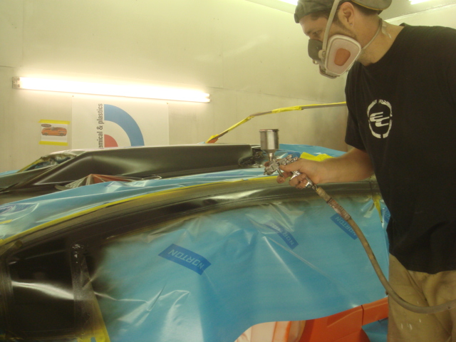 wel it is in the booth and I am spraying the stripes now. then the tricoat pearl over the whole car and lots of clearcoat. I was really hoping to finished tonight but it is already later then I thought so I might have to finish clearing tomorrow. here is a few pics of the layout.