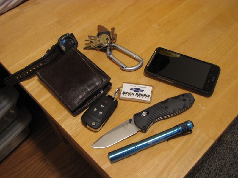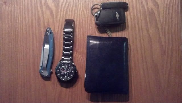 Normally I carry keys (2 sets), wallet, iPhone, and cash money occasionally lol. When I'm not at work I usually also have my Sig p238 or one of my other pistols. Still in the process of finding another smaller knife to replace my AFO Benchmade...