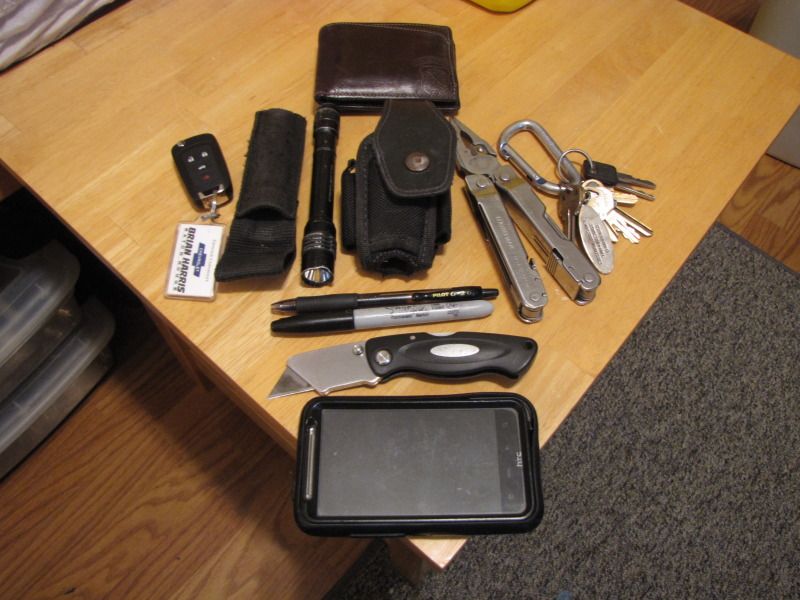 keep a Pen, Mechanical Pencil, Gerber Multi-Tool and Folder in the center console of the car, don't carry them with me. I also have a large LED Maglite mounted in the truck and wired to the battery for constant charge, and a small one on a belt clip hooked to the inside of the driver door map pocket.