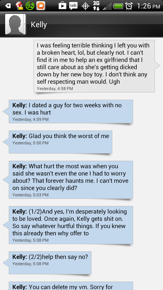 My Ex Girlfriend, Kelly, and I dated for some time. And I did make a mistake, I didnt cheat on her, but I was texting girls in a way that I shouldnt have been, and I know thats wrong, im not denying that.