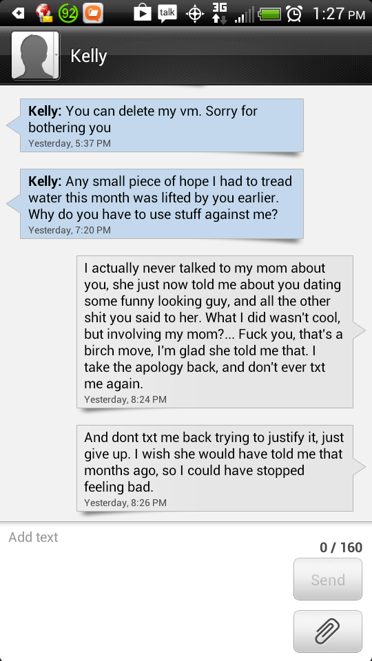 EDIT: Some irony. When we started dating, she told me her ex-boyfriend sent her mom text messages and ****ed up shit when they broke up, and how he was a bitch for doing that.... then she does it.