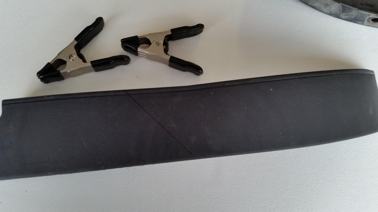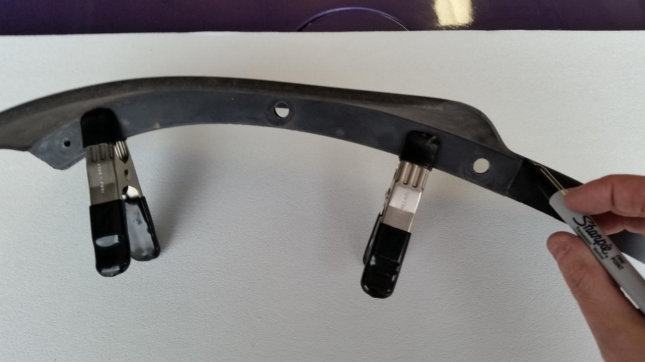 Take the new driver side deflector and the old passenger side deflector, placing their mounting surfaces against each other. Align the mounting holes and clamp them together. Use the Sharpie to mark the end of the new deflector where the old one stops. Unclamp the pieces, and align the bottom edges in the same manner. The bottom lip is much narrower, and may be tricky to clamp, but it's important to clamp them for best results. Once clamped, again mark the new piece at the end of the old piece. Unclamp, then connect the two marks using the straight edge. Clamping the straight edge to the deflector is a good idea, as you can use it for a cutting guide. This line should be at an diagonal across the face of the deflector, mirroring the passenger side piece you used as a marking guide.
