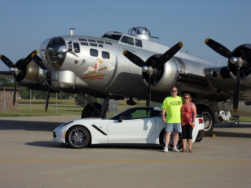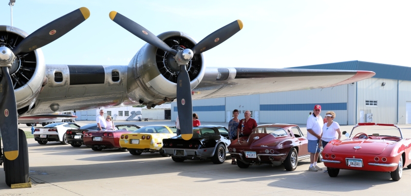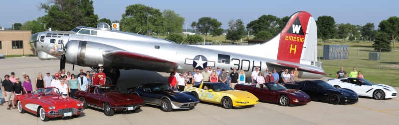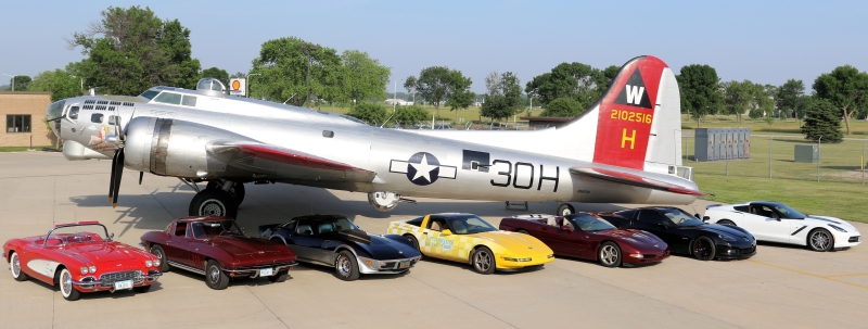Once the group shot was done, everyone had their chance to get individual shots with their Corvettes and plane. Legends of the Highway meet a Legend of the Skyway. History of the Boeing B-17 The Boeing B-17 Flying Fortress is a World War II bomber used primarily in Europe. B-17s from the Eighth Air Force participated in countless missions from bases in England, often lasting for more than eight hours, and struck at targets deep within enemy territory. Because of their long-range capability, formations of B-17s often flew into battle with no fighter escort, relying on their own defensive capabilities to insure a successful mission. During the war, B-17s were among the most modern aircraft in the U.S. inventory. However, the advent of the jet age and advances in technology made the Flying Fortress obsolete soon after the conclusion of the war. In the years following World War II, most B-17s were cut up for scrap, used in Air Force research or sold on the surplus market. In 1934, the Boeing Aircraft Company of Seattle, Washington, began construction of a four-engine heavy bomber. Known as Boeing model 299, it first took flight on July 28, 1935. The government ordered production of 13 of these aircraft, now designated the Y1B-17. Delivery of these first production models was between January 11 and August 4, 1937. The B-17 received the name Flying Fortress from a Seattle reporter who commented on its defensive firepower. The B-17 underwent a number of improvements over its 10-year production span. Models ranged from the YB-17 to the B-17-G model. Throughout the war, the B-17 was refined and improved as battle experience showed the Boeing designers where improvements could be made. The final B-17 production model, the B-17G, was produced in larger quantities (8,680) than any previous model and is considered the definitive Flying Fortress. With its 13 .50-caliber machine guns – chin, top, ball and tail turrets; waist and cheek guns – the B-17G was indeed an airplane that earned the respect of its combatants. In addition, air crews liked the B-17 for its ability to withstand heavy combat damage and still return its crew safely home. Between 1935 and May 1945, 12,732 B-17s were produced. Of these aircraft, 4,735 were lost during combat missions. At one time, more than 1,000 B-17s could be assembled for mass combat missions. Today, fewer than 100 B-17 airframes exist and fewer still are in airworthy condition. Less than 15 of Boeing's famous bombers can still take to the air, including EAA’s Aluminum Overcast. EAA’s B-17 Aluminum Overcast EAA’s B-17G-VE, serial number 44-85740 - nicknamed Aluminum Overcast –was delivered to the U.S. Army Air Corps on May 18, 1945. Although delivered too late to see action in World War II, the airplane has an interesting history. First Owner Purchased as surplus from the military inventory for a mere $750 in 1946, the airplane has flown more than 1 million miles. It has served as a cargo hauler, an aerial mapping platform and in pest control and forest dusting applications. Return to Military Roots The airplane's return to its military roots began in 1978, when it was purchased by a group of investors who wished to preserve the heritage of the magnificent B-17. The group, "B-17s Around the World," was headed by Dr. Bill Harrison. Their goal was to return the B-17 to its former glory. Donation to EAA The economic reality of simply maintaining a vintage bomber, let alone the cost of restoration, prompted the group to donate the B-17 to EAA in 1983. Since that time, an extensive program of restoration and preservation was undertaken to ensure Aluminum Overcast would be a living reminder of World War II aviation for many years to come. The restoration has taken more than 10 years and thousands of hours by dedicated staff and volunteers at EAA’s headquarters in Oshkosh, Wisconsin. Aluminum Overcast proudly carries the colors of the 398th Bomb Group of World War II, which flew hundreds of missions over Nazi-held territory during the war. Aluminum Overcast commemorates B-17G #42-102516 which was shot down on its 34th combat mission over Le Manior, France, on August 13, 1944. Veterans of the 398th helped finance the bomber's restoration. The Airplane When the airplane was sold in 1946, most of the original military equipment had been removed. Over the years, these items have been located, restored and returned to Aluminum Overcast. These include: